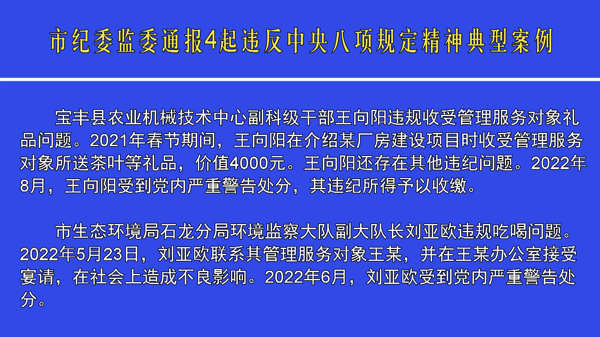 市紀委監(jiān)委通報4起違反中央八項規(guī)定精神典型案例
